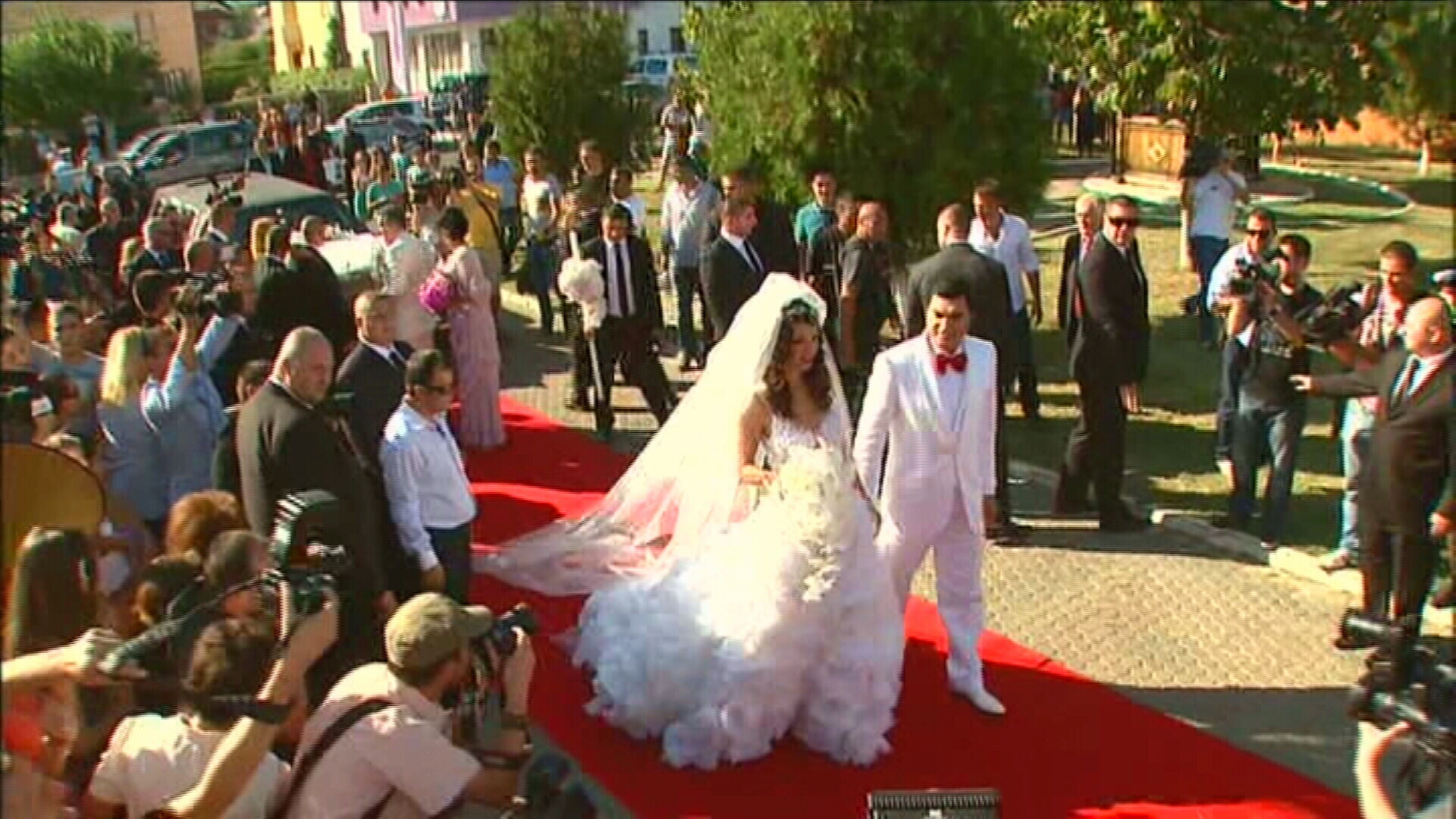Oaspetii nu si-au putut desprinde ochii ba de la mireasa, ba de la limuzina primita cadou de la nasul Gigi Becali, sau de la verighetele de 80.000 de euro. In total, presedintele clubului Dinamo a scos din buzunar aproape 1 milion de euro pentru acest eveniment.