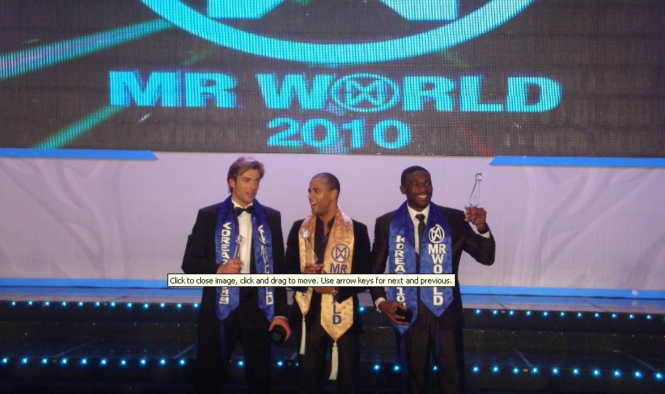 Ultimii cinci concurenti care s-au luptat pentru titlul de Mr. World au fost reprezentantii Cehiei, Nigeriei, Irlandei, Libanului si Olandei. Titlul de Mr World a revenit Irlandei. Pe locul doi s-a clasat reprezentantul Cehiei, iar pe trei cel al Nigeriei.