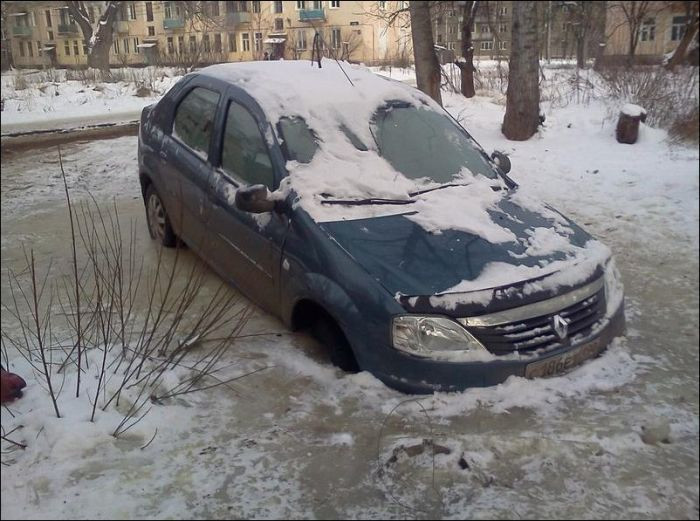 Cam asa ar putea fi definita si experienta unui rus, care dupa ce si-a parcat Loganul in fata blocului intr-o seara, s-a trezit cu el pe jumatate inghitit de gheata a doua zi, scriu rusii de la Webpark.