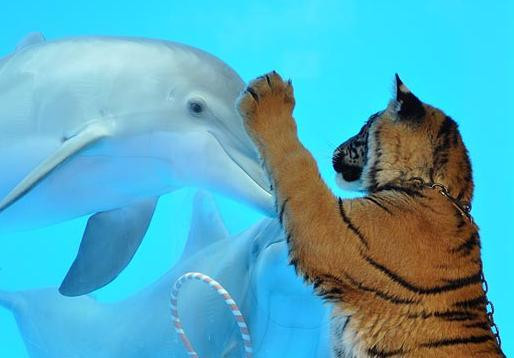 "Victimele" experimentului au fost delfinii care au dat nas in nas cu tigrul bengalez Akasha. Uriasa felina si-a lipit instant nasul de acvariu, visand probabil la un sushi proaspat. Noroc cu sticla de protectie...