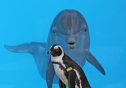 Nu la fel de entuziasmat a fost un pinguin african, care, arogant nevoie mare, le-a arata spatele prietenosilor delfini stransi gramada sa-l admire. Poate se imprietenesc data viitoare. :)