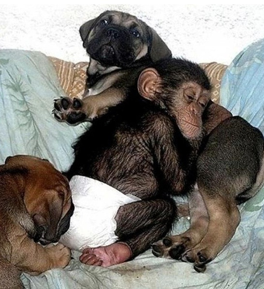 Un pui de cimpanzeu abandonat de mama la nastere a fost luat in grija de un angajat al gradinii zoologice in care s-a nascut si care avea o femela mastiff. Iar cand cateaua a dat nastere la randul ei, l-a adoptat si pe puiutul de cimpanzeu.