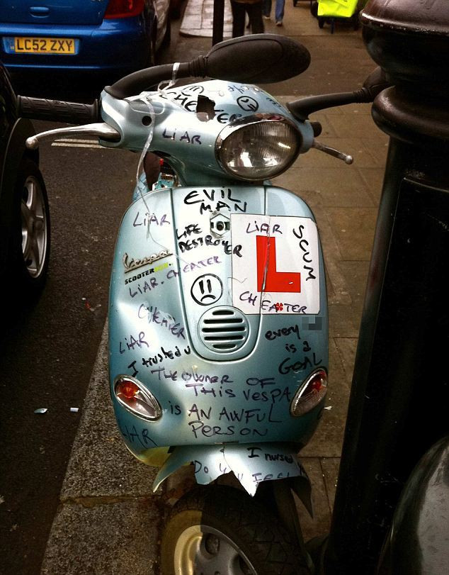 Mandrul posesor al unui scuter Vespa si-a gasit pretiosul autovehicul parcat in nordul Londrei plin de injurii, printre care “mincinos” si “ticalos”.