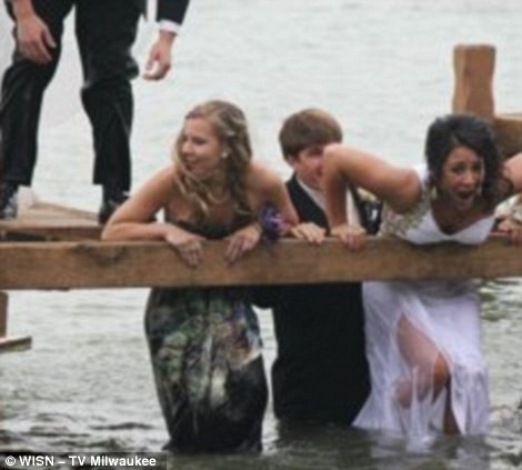 Din nefericire insa, pontonul s-a prabusit si tinerii au cazut cu totii in apa. Tinutele lor de gala au avut serios de suferit, chiar inainte de-a pleca la bal.