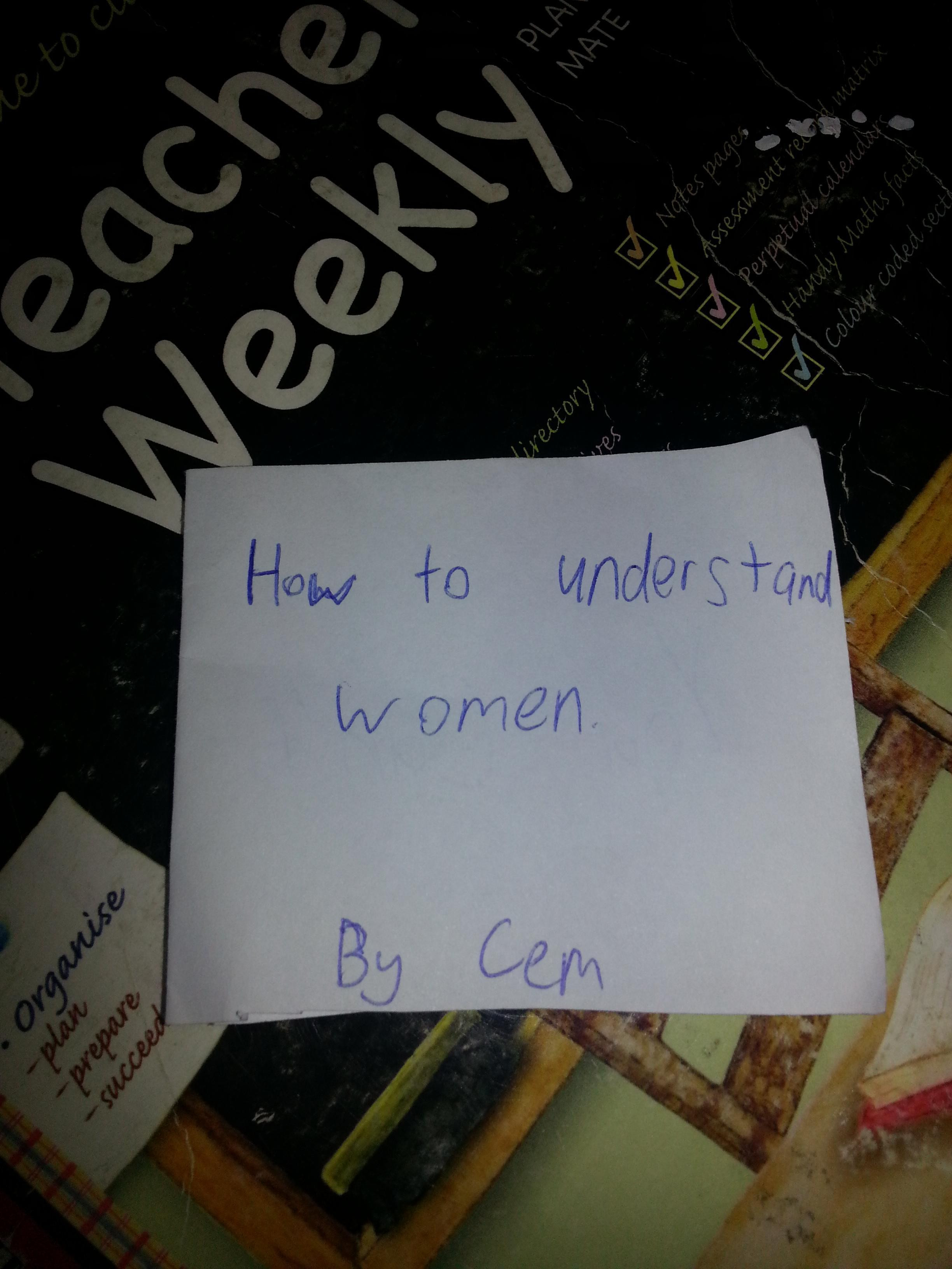 "Cartea" sau, mai corect spus, cele 4 pagini scrise de micul autor, incepe cu titlul "Cum sa intelegi femeile", continua cu explicatia "Acest Best Seller este despre intelegerea femeilor", pentru ca in continutul cartii sa apara, ironic, mesajul "Nu poti... (intelege femeile). Sfarsit"