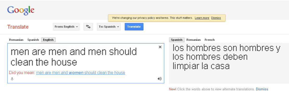 "Men are men and men should clean the house" este propozitia la care Google Translate are nevoie de lamuriri.
