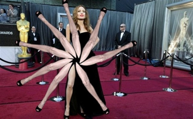 Scena de pe covorul rosu de la Oscar, in care Angelina Jolie pozeaza intr-o rochie care ii scoate in evidenta un picior, a inspirat multe trucaje amuzante, care cu siguranta n-ar incanta-o pe vedeta.