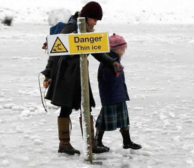In galeria foto veti vedea si un instantaneu cu o mama care traverseaza cu fetita de mana un pod de gheata subtire, ignorand total pericolul care este anuntat de un indicator.
