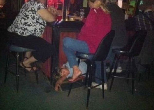 In alta imagine, o fetita doarme la picioarele mamei, care sta si bea la un bar.