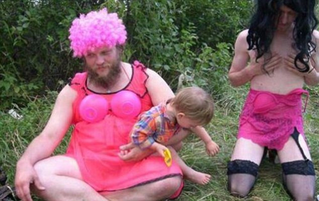 Astfel, in una din fotografii, un tata rasfoieste revista pentru adulti Playboy, in timp ce isi tine copilasul in brate. Desi e foarte mic, bebelusul pare si el atras de “peisaj”.