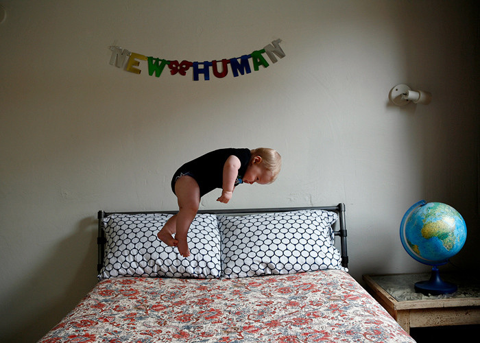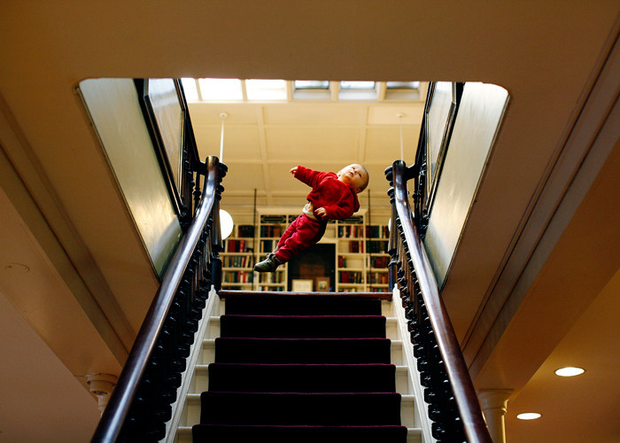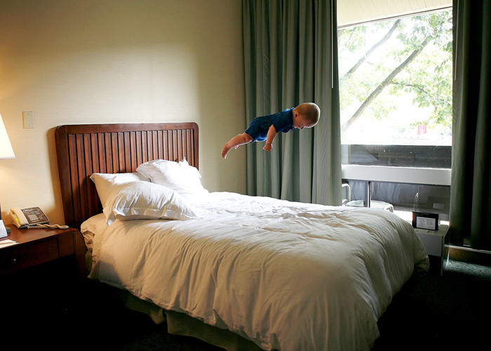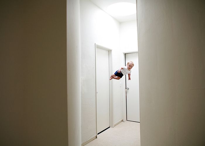 Fotografa Rachel Hulin si-a surprins bebelusul in posturi absolut ciudate, in toate camerele din casa. Nu vrea insa sa explice ce tehnica a folosit sau cum de micutul a ajuns in aceste pozitii.