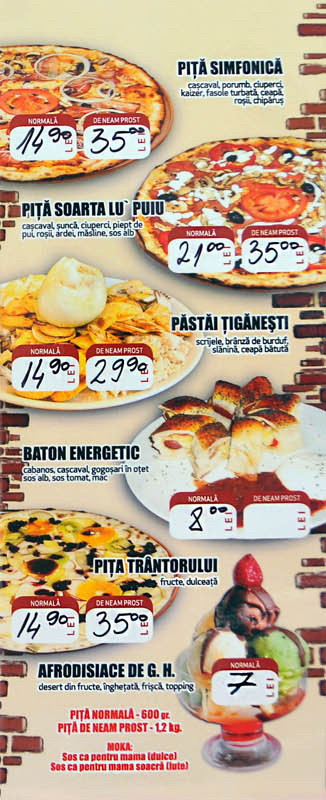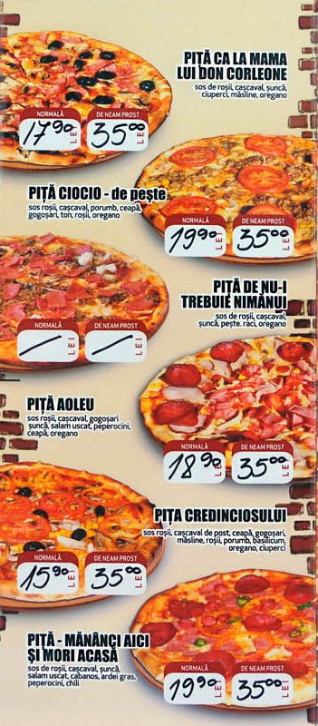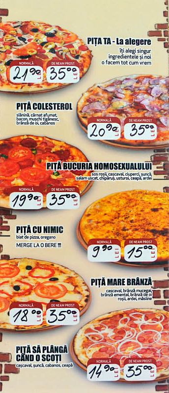 Te uiti si castigi devine te uiti si razi cand citesti meniul unei pizzerii din Gura Humorului. In meniu nu exista calzone, capriciosa sau foccacia. Exista insa "piţa colesterol", "piţa mananci aici si mori acasa" sau chiar ... "piţa bucuria homosexualului".