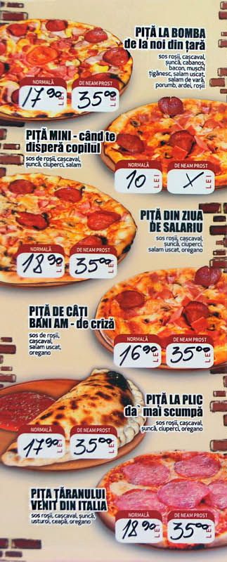 Pizza "mananci aici si mori acasa" in varianta "normala" sau "de neam prost". Un meniu romanesc 100%