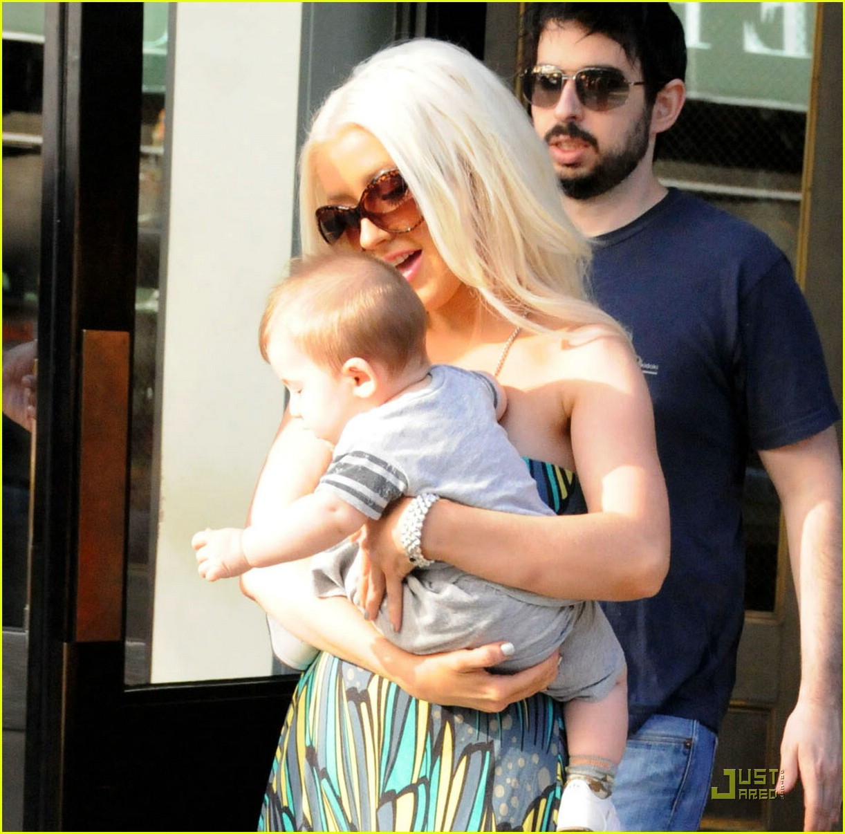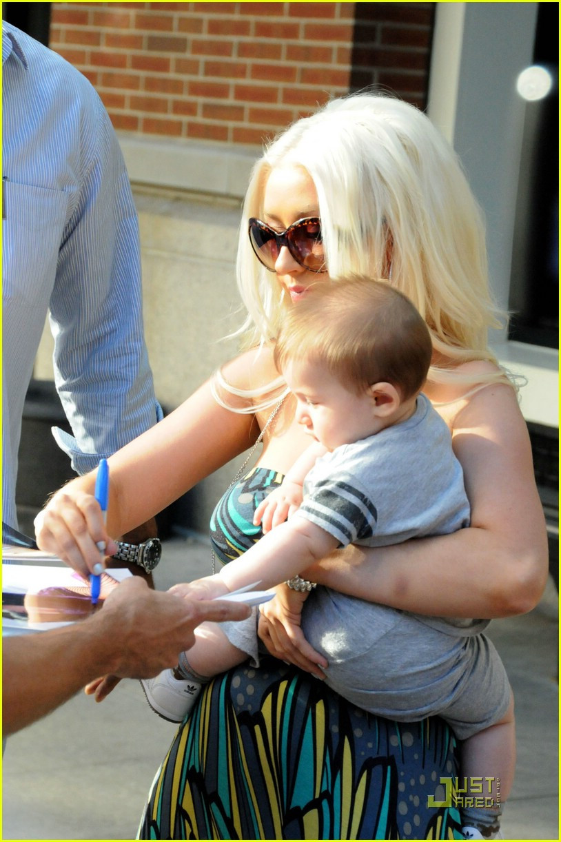 Dupa cina, Christina Aguilera a fost oprita de cativa fani pentru a da cateva autografe. Artista s-a conformat, desi era ocupata sa-si tina fiul in brate.
