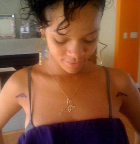 Initial, Rihanna alesese sa isi tatueze doua pistoale. Se pare ca nu i-a placut cum aratau, asa ca a ales unul singur.