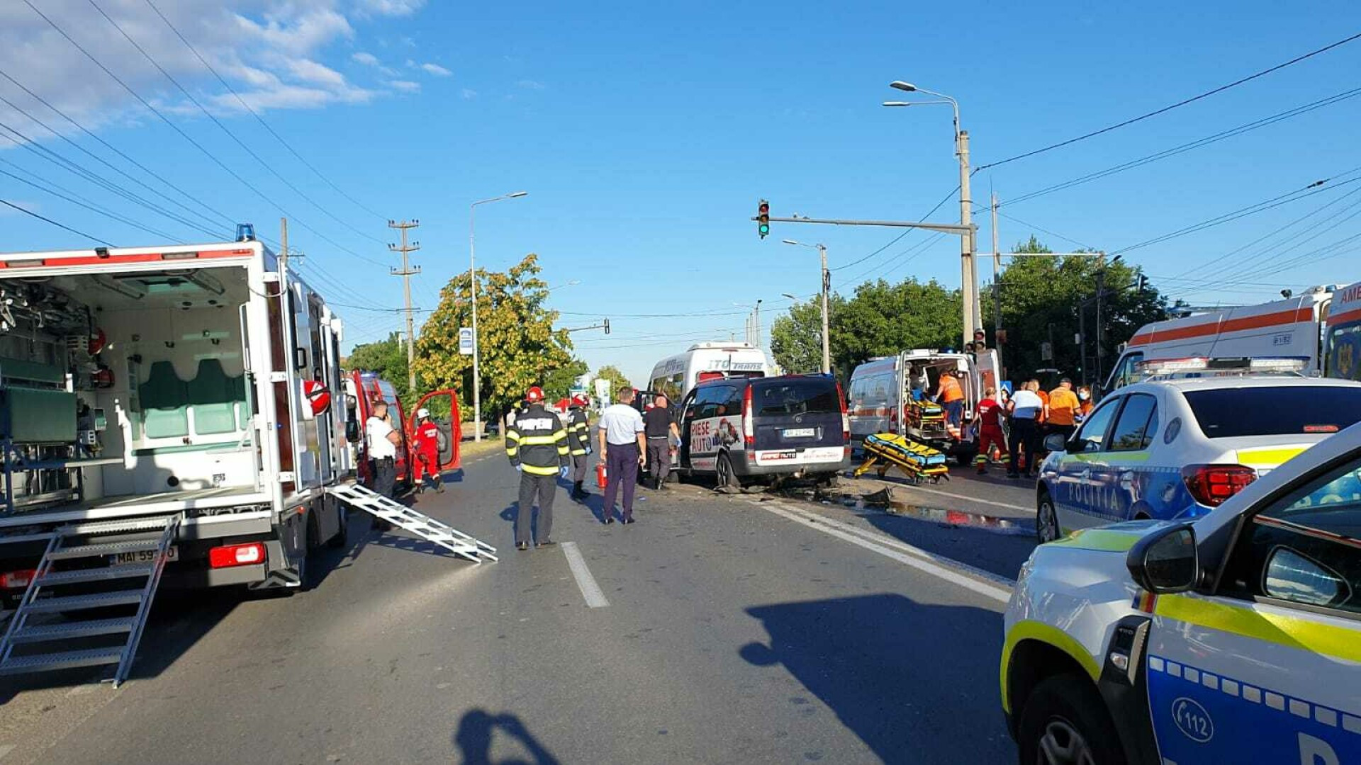 15 persoane au ajuns la spital, după ce o mașină și două microbuze s-au ciocnit violent luni dimineață, în Arad, la ieșirea spre Nădlac.