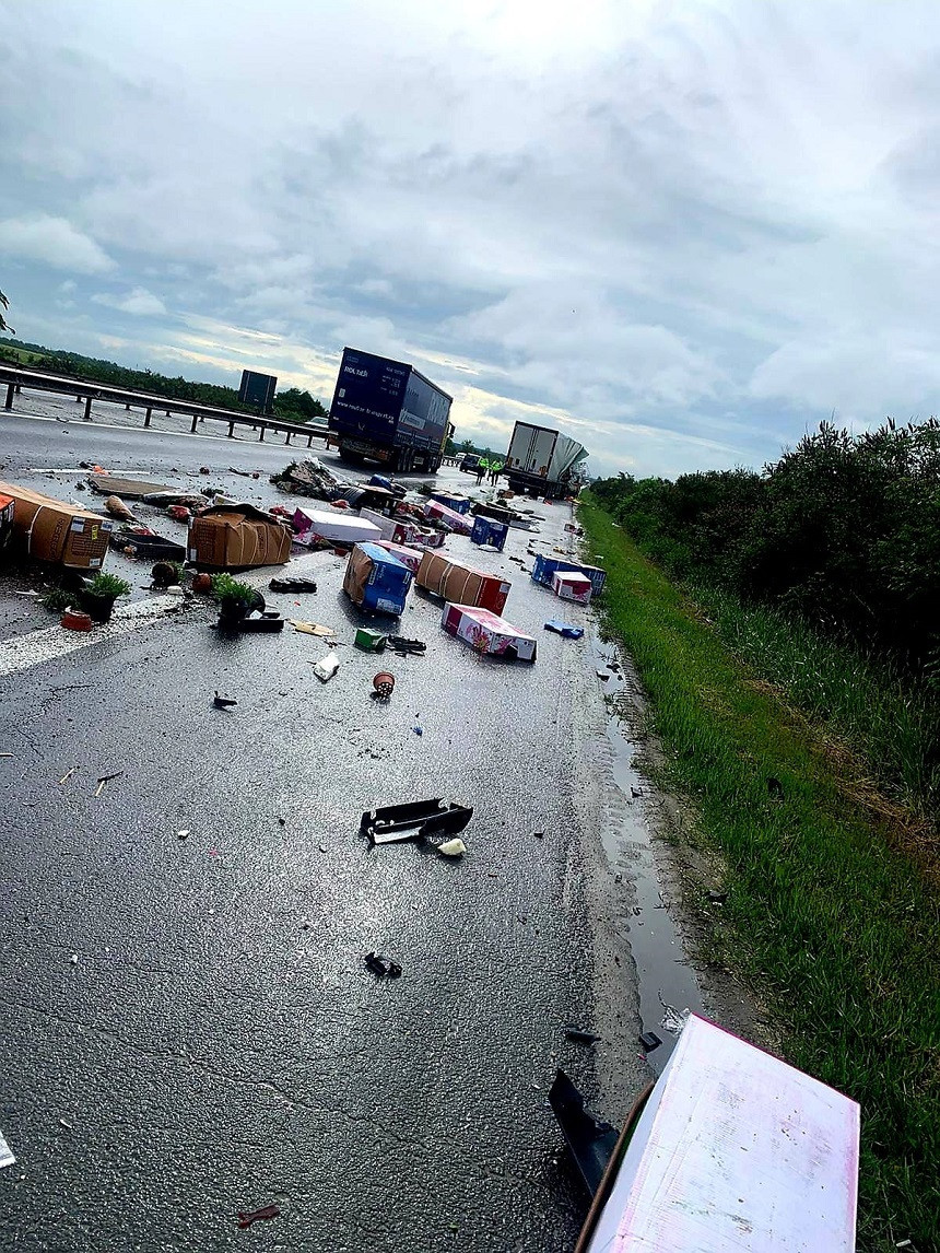 Bucăţi din caroseria celor două camioane, dar şi o parte din încărcătura unuia dinte ele au ajuns pe şosea.