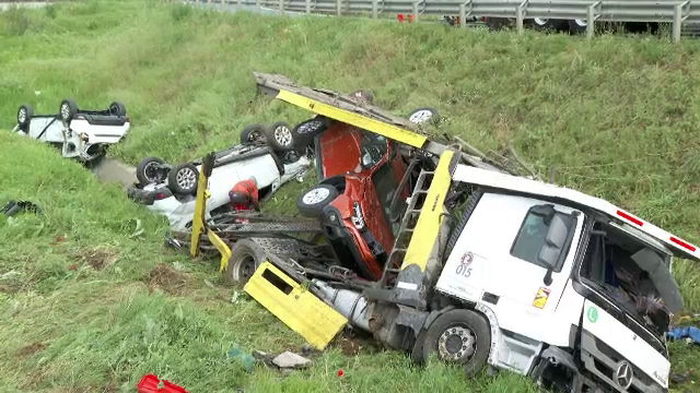 Echipajele de salvare l-au găsit pe șofer inconștient, blocat în cabina distrusă. Omul a fost dus la spital, dar s-a stins după câteva ore. Cele opt mașini din TIR s-au făcut praf. Unele au rămas ancorate în remorca răsturnată, altele au ajuns pe câmp.