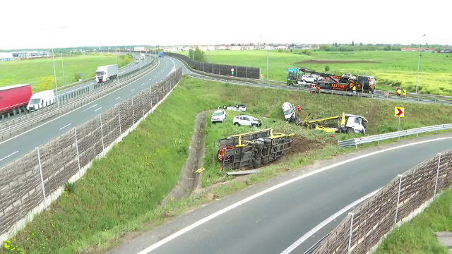 Un TIR încărcat cu opt autoturisme noi s-a răsturnat la ieșirea de pe autostrada A1, în județul Arad, iar șoferul a murit.