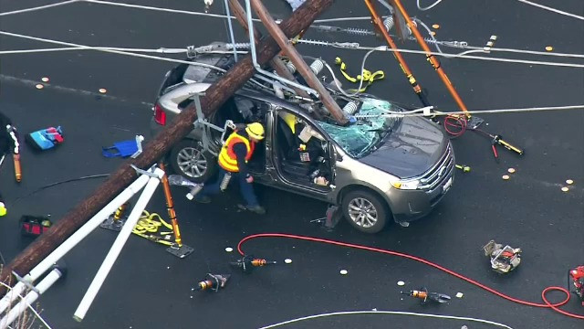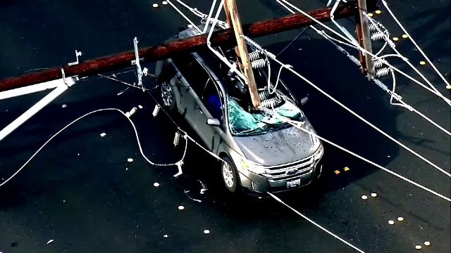 Doi americani, soţ şi soţie, se consideră norocoşi că mai sunt în viaţă, după ce mai mulţi stâlpi de electricitate s-au prăbuşit pe stradă pe care circulau cu mașina și i-au prins la mijloc.