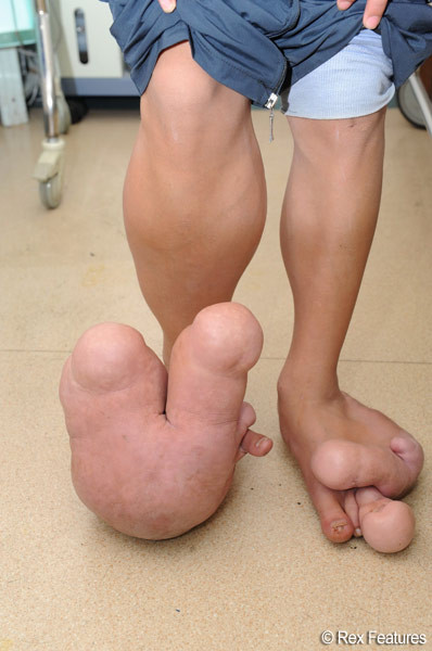 Xiao Meng, un baiat din China, sufera de o afectiune extrem de rara, din cauza careia picioarele lui s-au umflat si au ajuns la dimensiunile unor pepeni. Boala a inceput sa se manifeste inca de la varsta de un an, cand degete si labele picioarelor au inceput sa ia proportii.