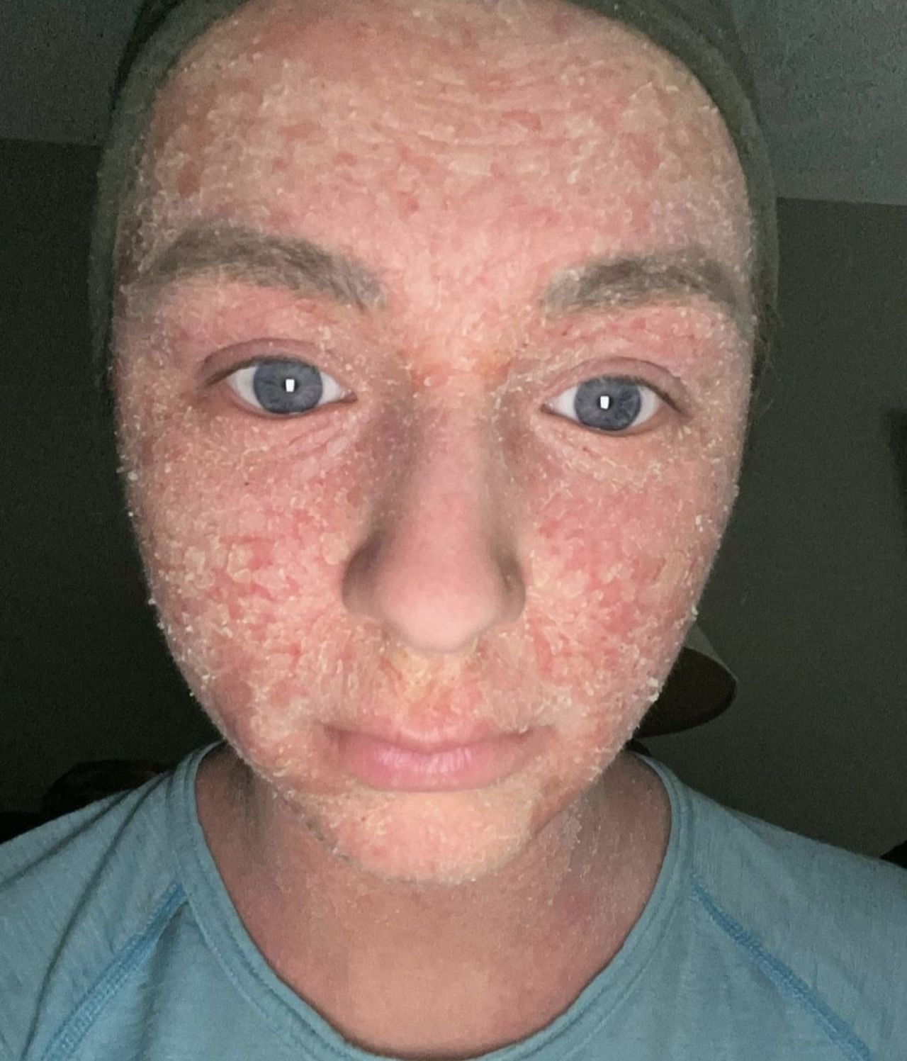 După ce a renunțat la creme, pielea ei a devenit atât de roșie încât părea că suferă de arsuri solare extreme.