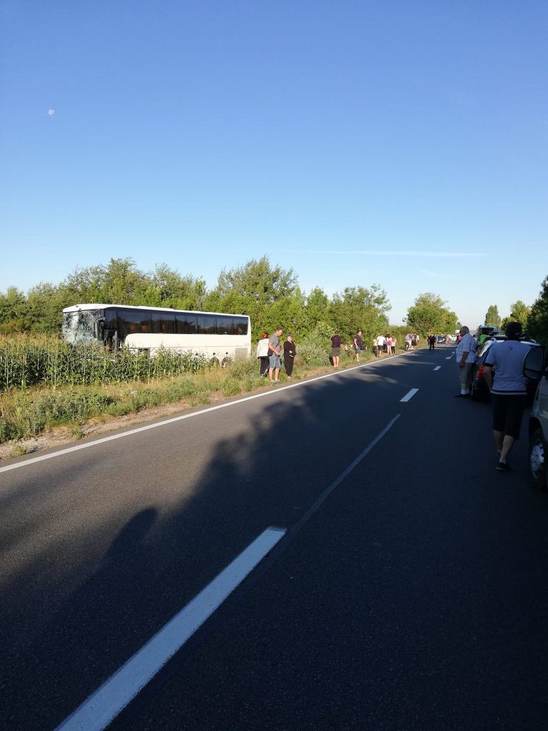În autocar se aflau 24 de pasageri şi doi şoferi, unul dintre aceștia suferind răni ușoare la picioare.