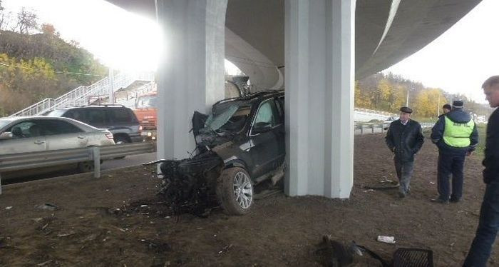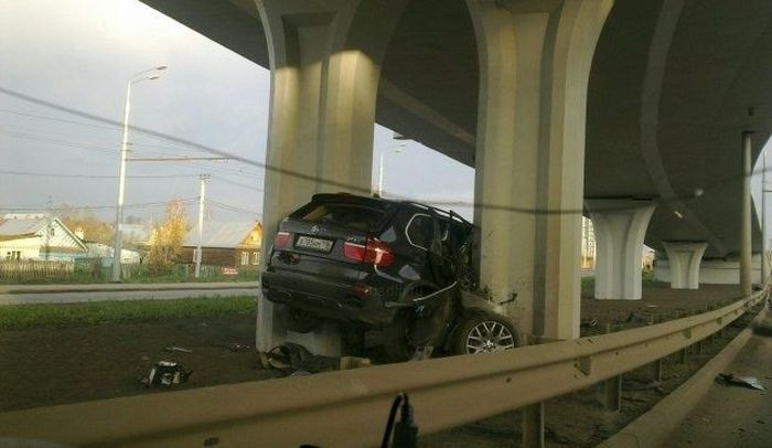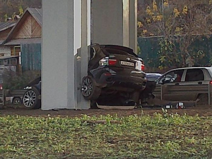 Un sofer din Rusia care a pierdut controlul volanului masinii sale SUV a ajuns cu automobilul intre stalpii de rezistenta al unui pasaj suprateran.