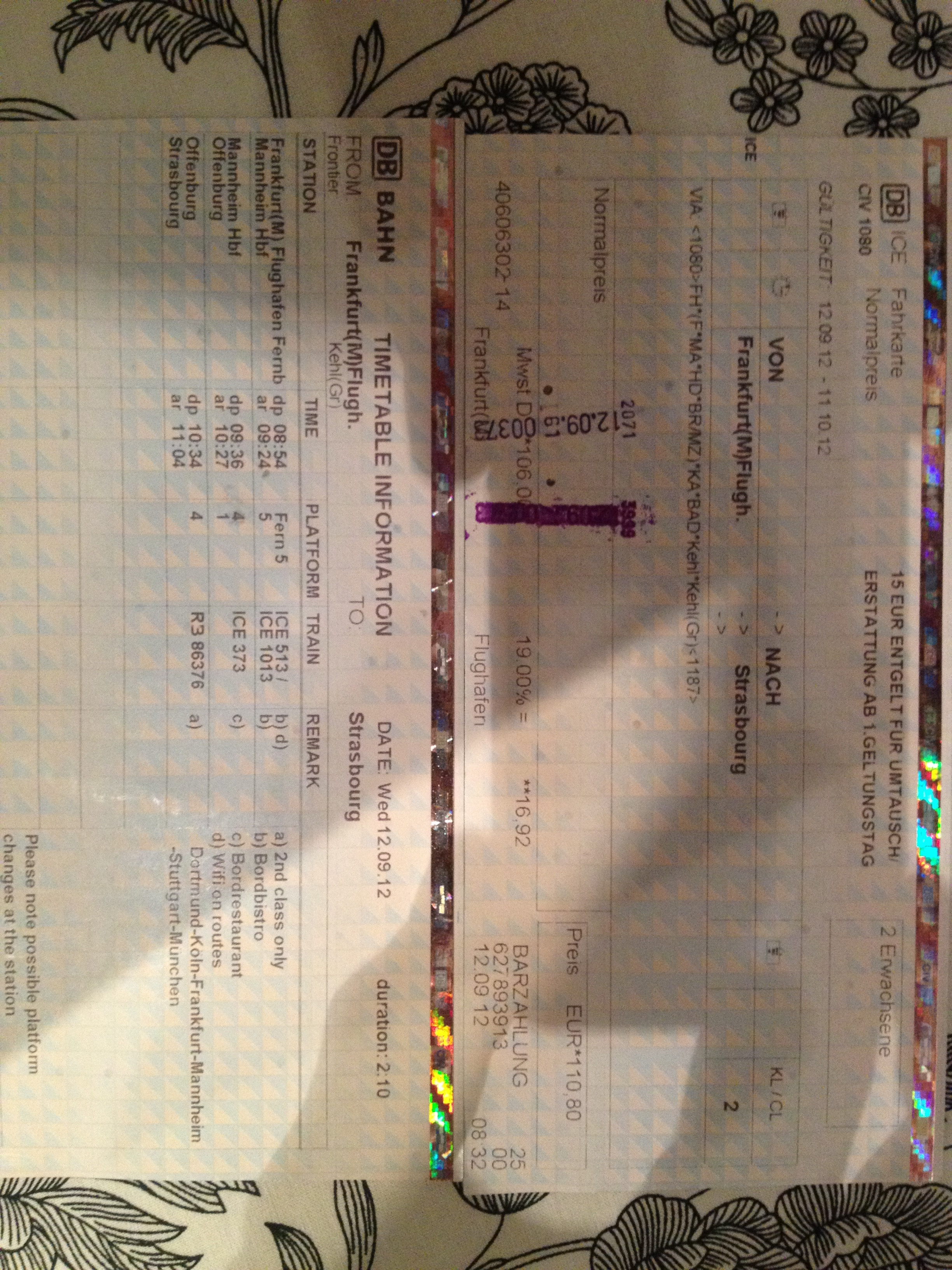 La nemti am luat trenul din aeroportul Frankfurt catre Strasbourg, unde se discuta in Parlamentul European situatia politica din Romania. Am mers cu “ICE”, perla Deutsche Bahn, varful de lance al transporturilor feroviare nemtesti. 55 de euro pentru 205 km parcursi impecabil in 2 ore si 10 minute (1 ora si 50 minute daca deducem timpul dintre cele 2 trenuri pe care le-am schimbat pe parcurs).