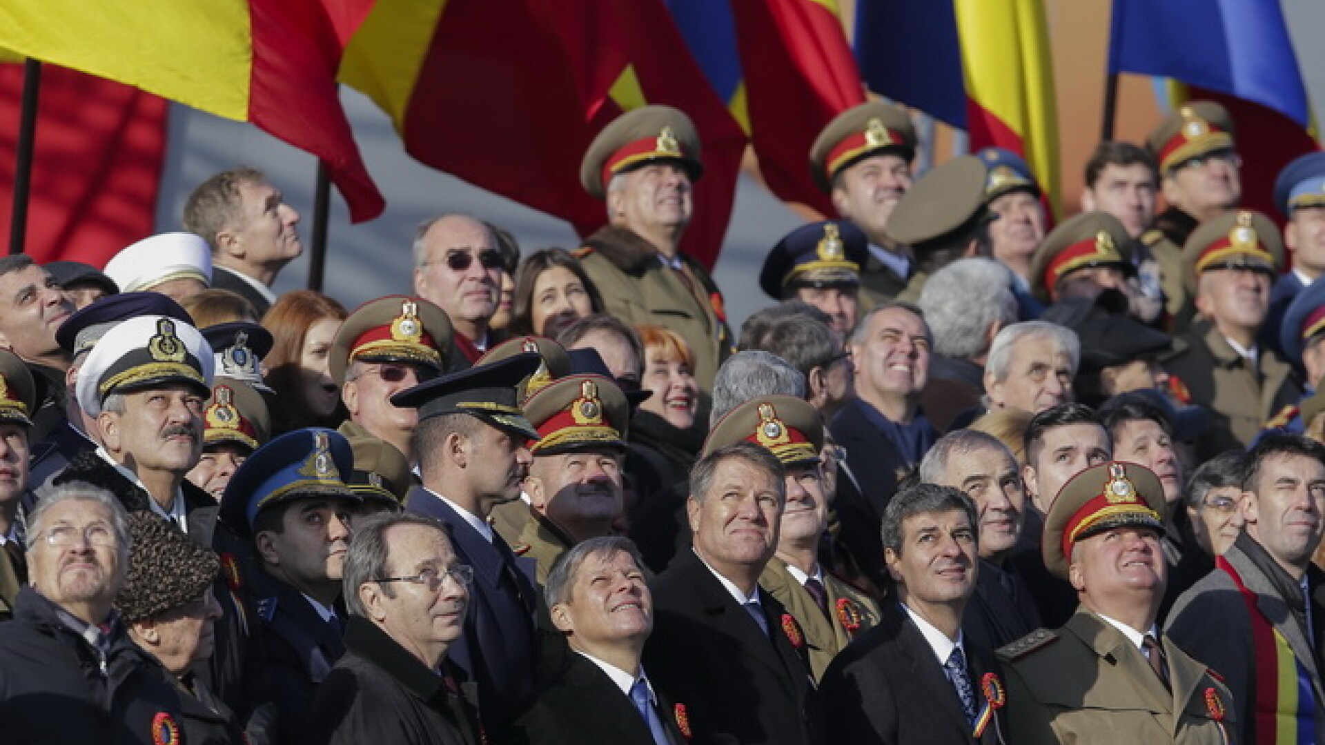 10:50 La parada au ajuns fostii presedinti ai Romaniei dupa 1989, Ion Iliescu, Emil Constantinescu si Traian basescu, care stau unul langa altul.