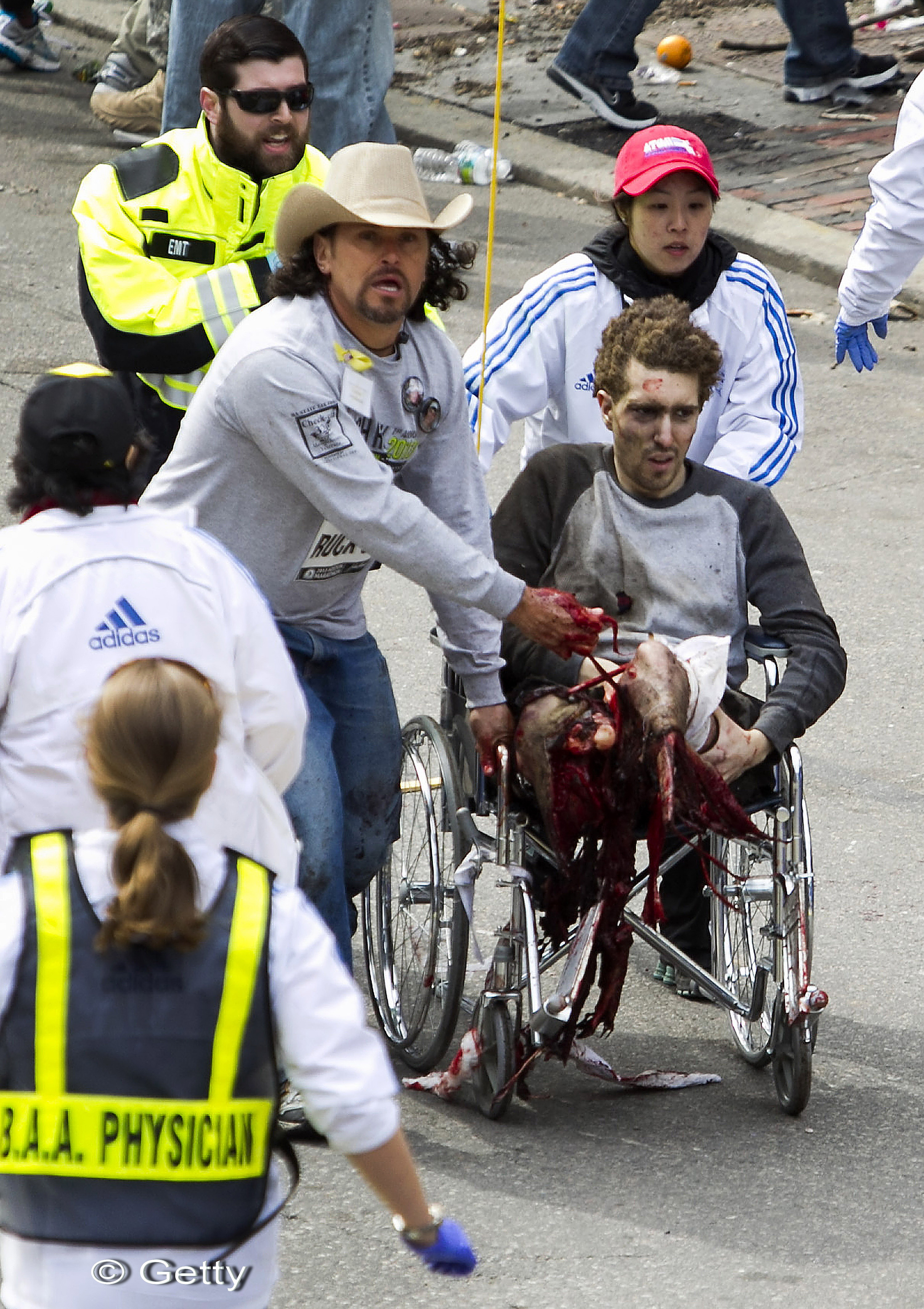 Realizata de un fotograf de la Boston Globe, poza il arata trantit la pamant pe un veteran participant la maraton - Bill Iffrig - in timp ce langa el trei politisti cu fetele marcate de panica isi scot armele.