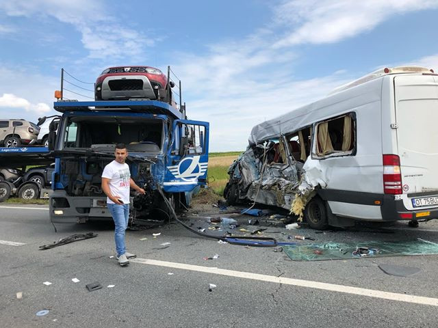 UPDATE 18:00 19 persoane au avut nevoie de îngrijiri medicale, după ce trei maşini, două tiruri şi un microbuz s-au ciocnit violent.