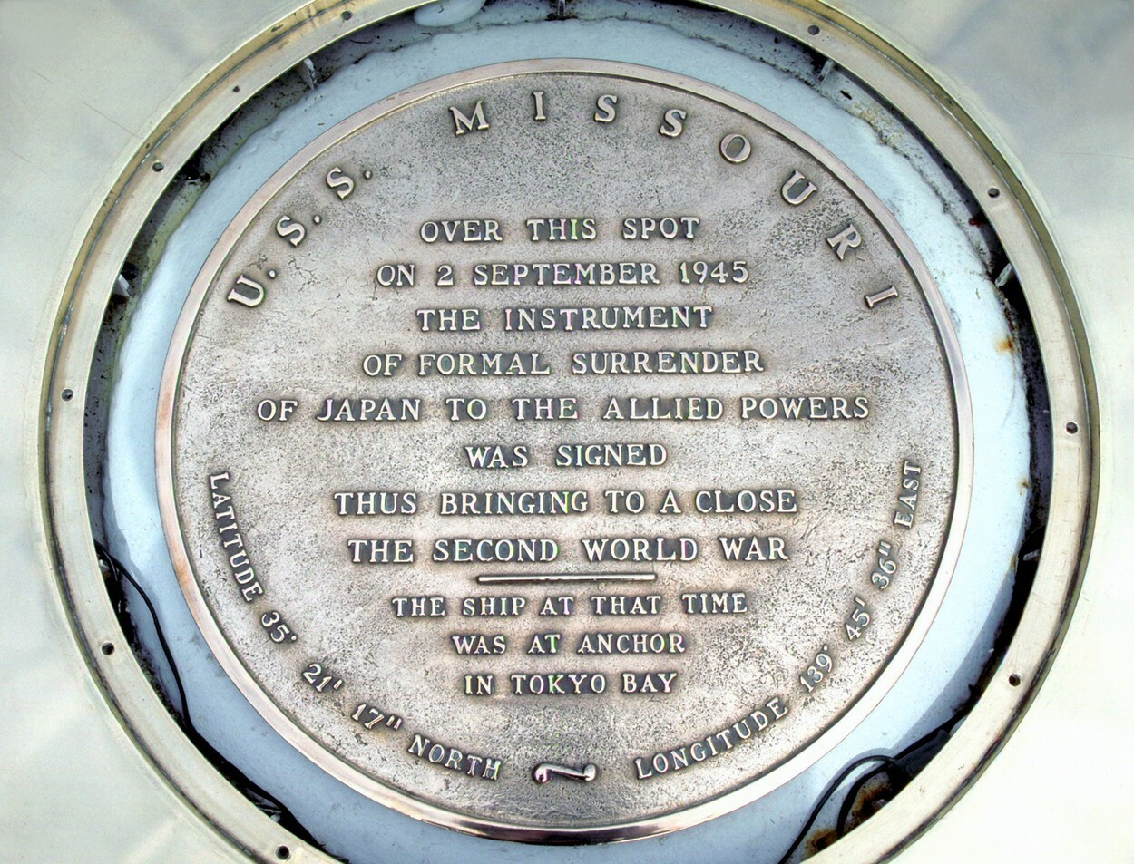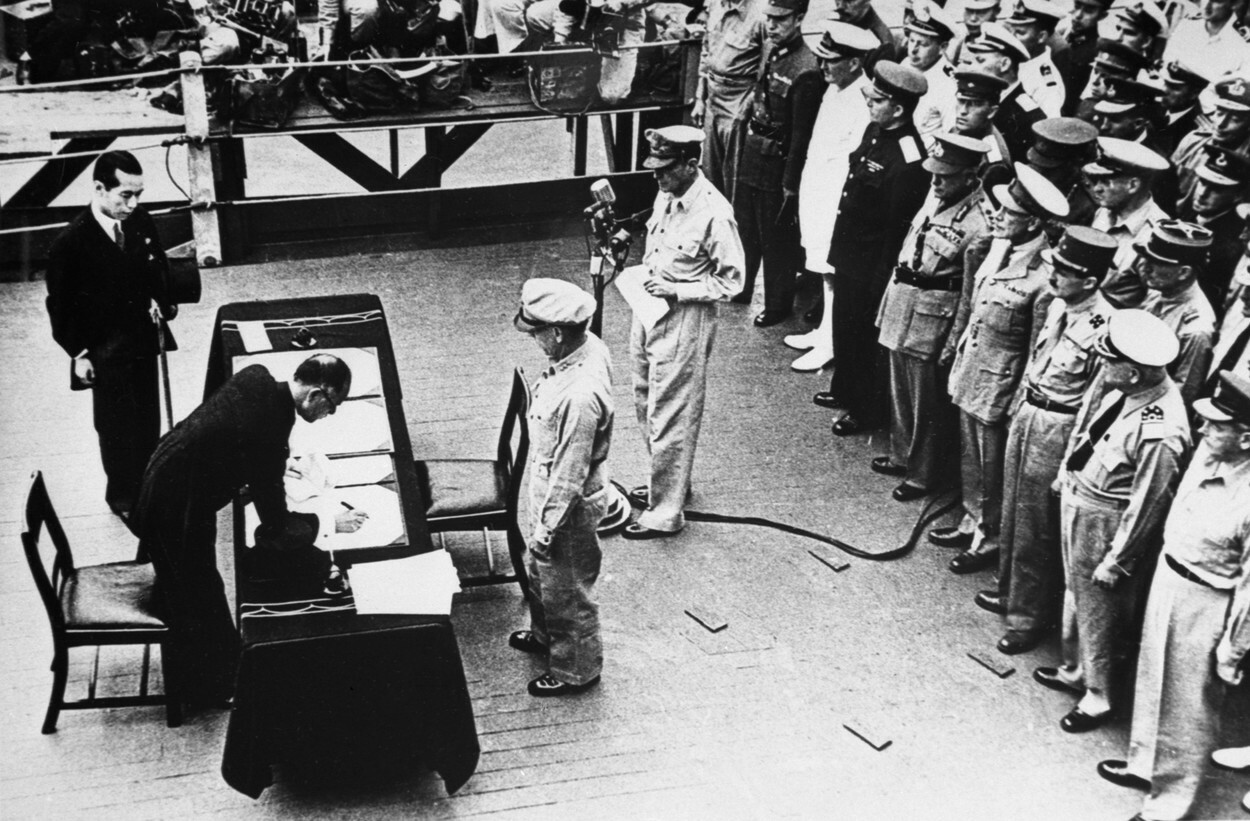 La 2 septembrie 1945, capitularea japoneză a fost semnată la bordul navei USS Missouri în Golful Tokyo. Aceasta a pus capăt celui de-al Doilea Război Mondial în Asia.