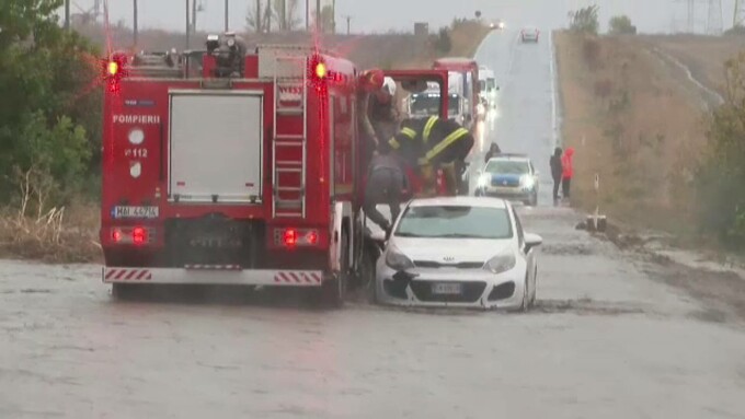 În localitatea Țepeș Vodă din județul Constanța, cât vezi cu ochii terenurile sunt inundate. Un șofer a fost surprins de viitură și dus pe câmp cu mașina. Pompierii au mers 1 km pe jos până la el.