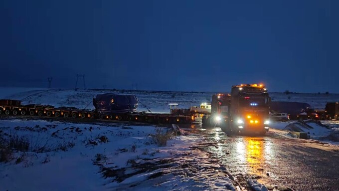 Corespondent ȘtirileProTV: Și așa arată cel mai mare utilaj al mașinăriei. Cântărește peste o sută de tone și a fost adus pe un trailer modular de 24 de axe, practic 192 de roți. Alte trei transporturi sunt așteptate în cursul acestei zile. În total, autoritățile coordonează 95 de curse, astfel încât toate aceste piese să ajungă pe platforma din Călărași.