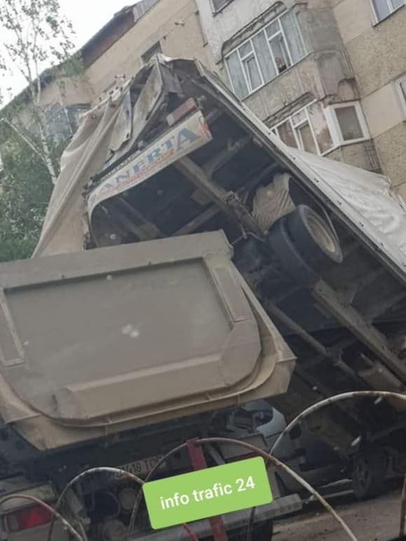 Șoferul unui camion s-a trezit cocoțat la propriu cu mașina pe bena unui autotren pentru transportul pietrișului. Imaginile cu cele două vehicule sunt spectaculoase.