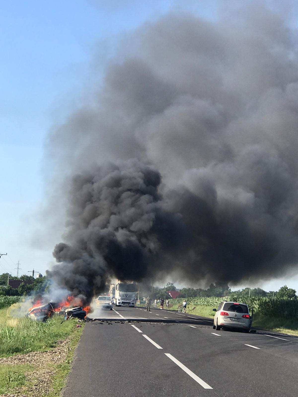Accident dramatic pe E85. Una dintre maşini a luat foc, după o ciocnire frontală