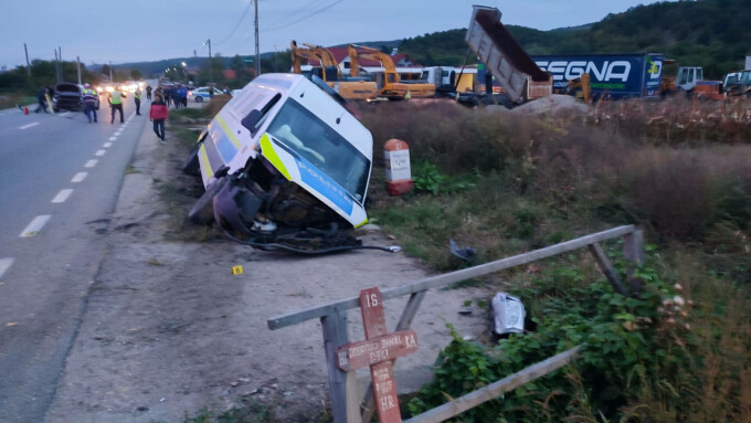 În urma impactului, duba Poliției a fost proiectată într-un cap de pod, iar apoi a ajuns în șanț.