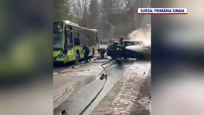 Accident grav în Sinaia. O mașină a luat foc după ce s-a izbit de un autobuz cu 15 oameni. Cinci persoane au fost rănite