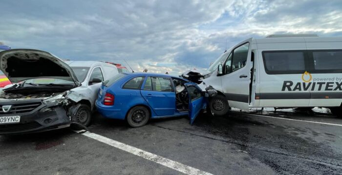 Accident grav între un microbuz şi două mașini, în Timiș. 10 persoane au fost rănite | FOTO
