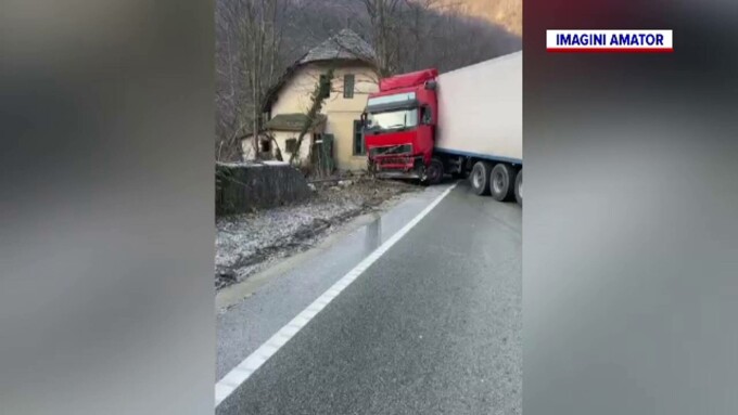 Un camion încărcat cu lemne a blocat circulația mai multe ore, după ce a derapat din cauza poleiului și a lovit acoperișul unei case.