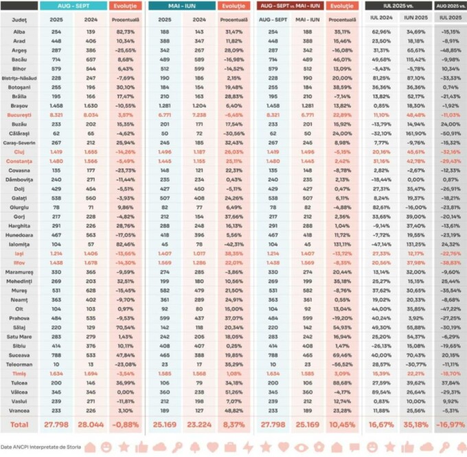La nivel național, evoluțiile au fost însă diametral opuse în marile județe: s-au înregistrat creșteri puternice în Iași (36,5%) și Timiș (+17,7%), dar și scăderi majore în Cluj (-15,8%) și Constanța (-6,7%).