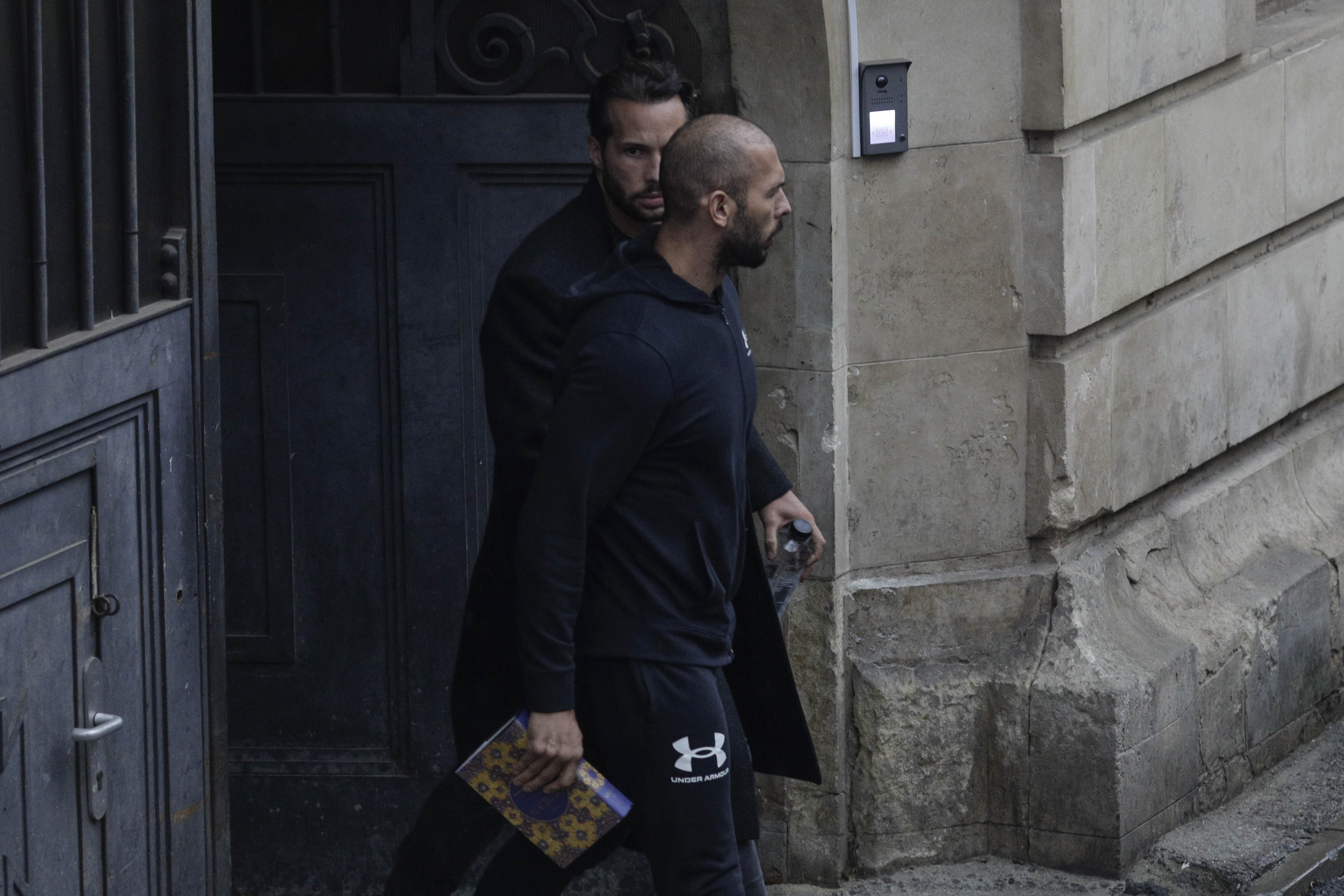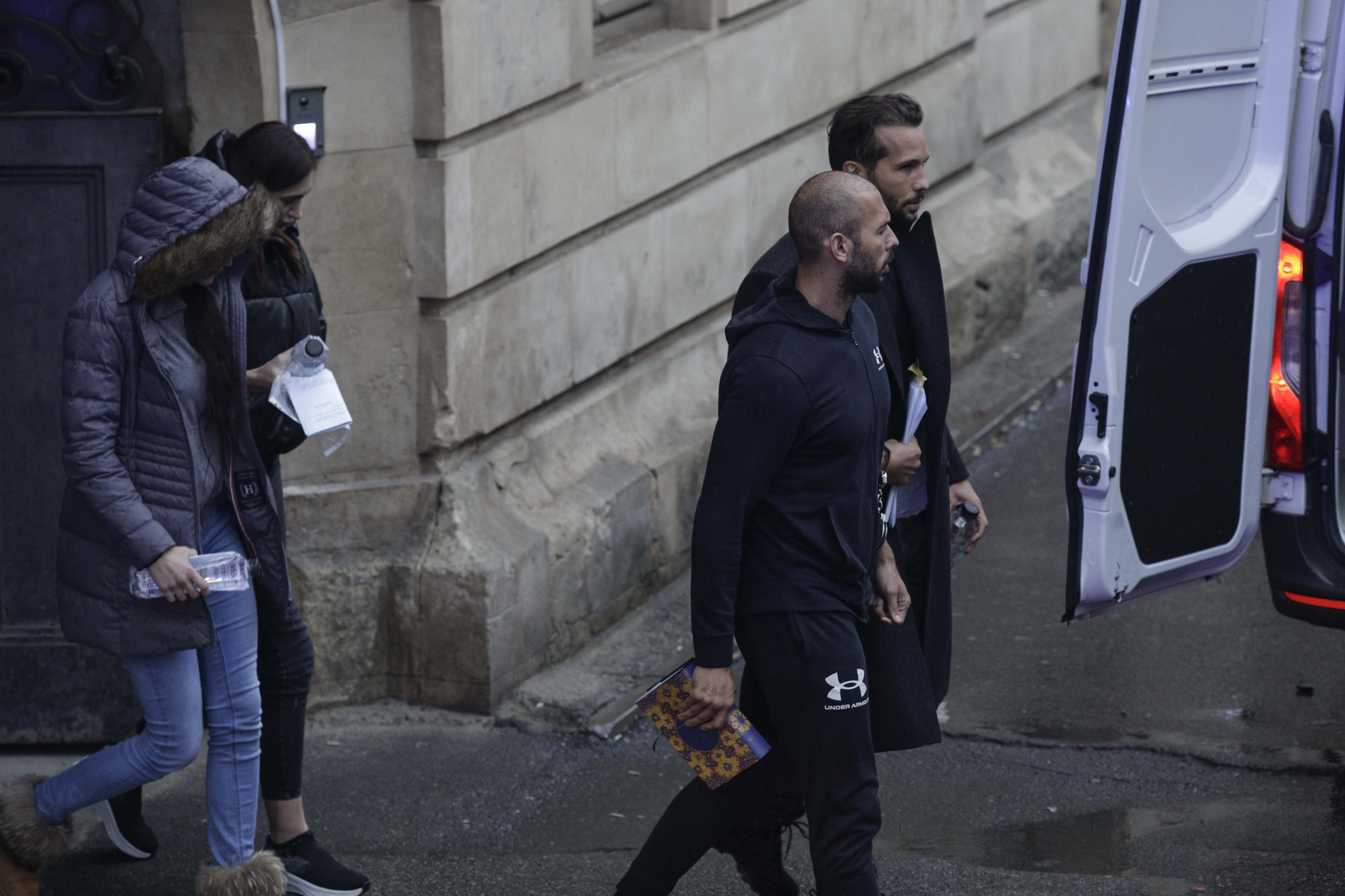 Andrew și Tristan și două femei din România au fost fotografiați în timp ce erau escortați de oamenii legii în Curtea de Apel București.