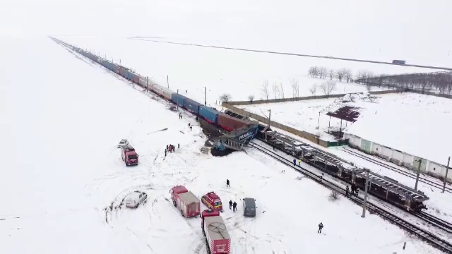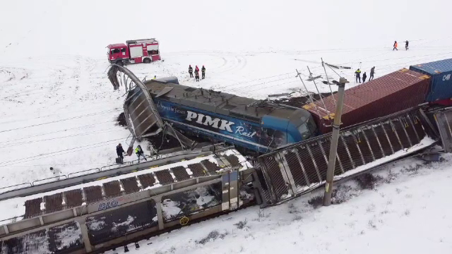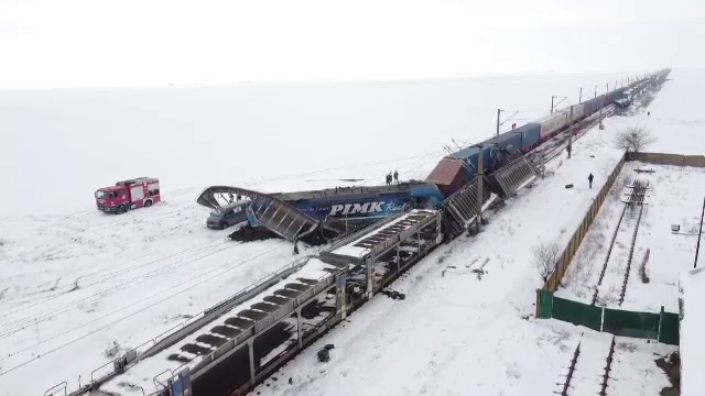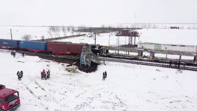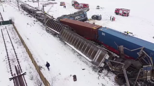 Unul dintre trenurile de marfă este rupt în două și are mai multe vagoane înclinate pe șine. Locomotiva celuilalt a ieșit în câmp - aproape perpendicular pe calea de rulare.