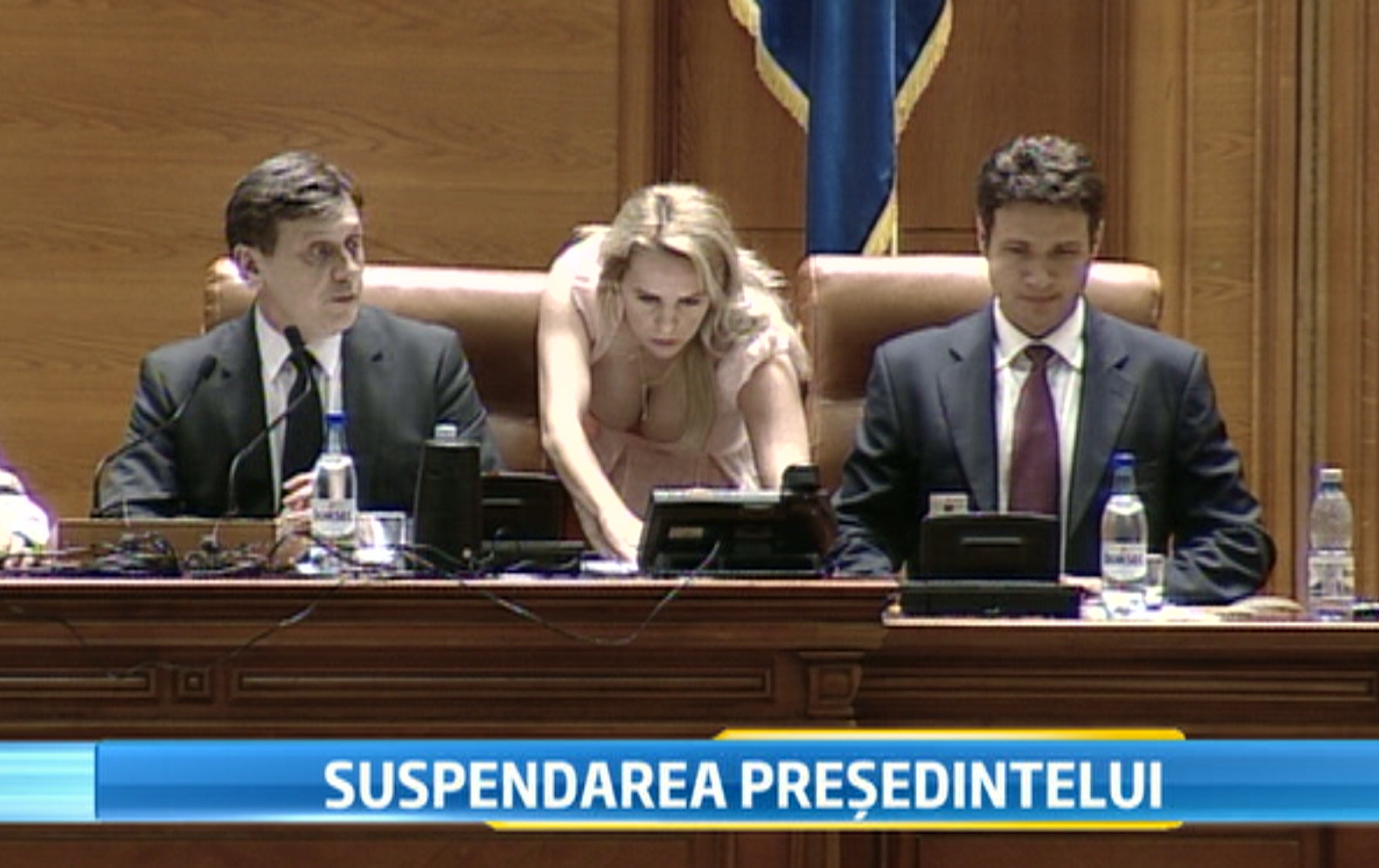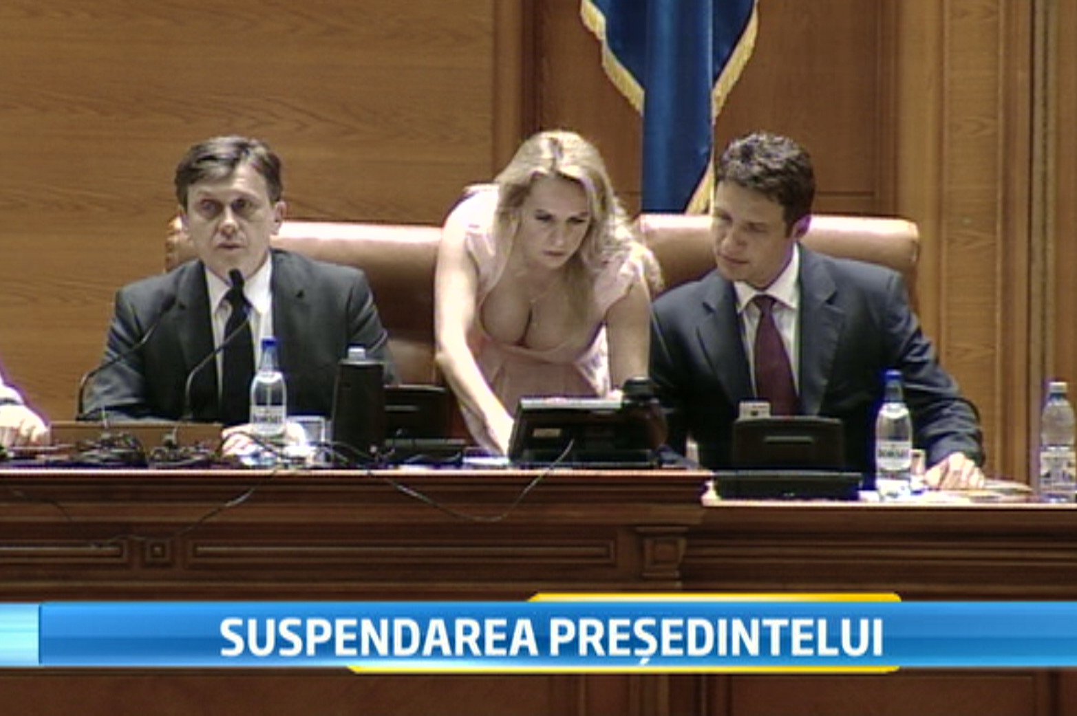 O superba domnisoara a fost alaturi de Crin Antonescu la inceputul sedintei ce decide soarta lui Traian Basescu. In momentul in care tanara s-a aplecat sa-i inmaneze presedintelui Senatului o mapa, decolteul ei bine definit a atras toata atentia barbatilor din sala.