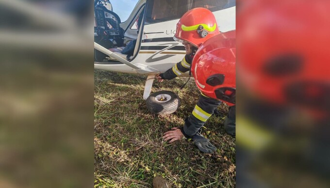 Pilotul unui avion ultraușor a reușit să aterizeze în siguranță pe aerodromul din localitatea Dumbrava, comuna Timișești, după ce, în timpul unei manevre, au apărut defecțiuni la roata din spate.