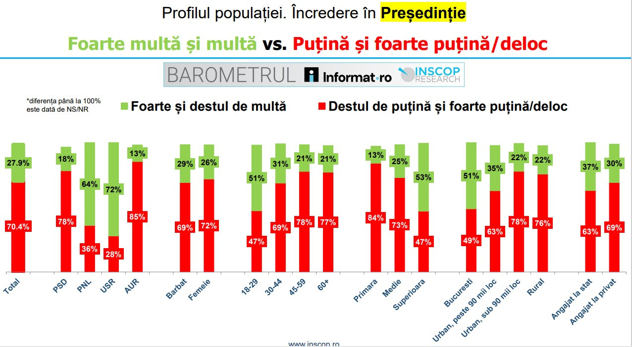 Votanţii PNL şi USR, tinerii sub 30 de ani, persoanele cu educaţie superioară, locuitorii din Bucureşti şi din urbanul mare, angajaţii la stat sunt categoriile care au cea mai multă încredere în Preşedinţie.