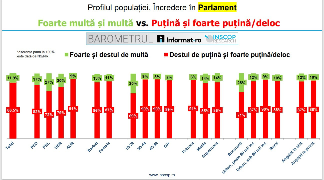 Au încredere în Guvern în special: votanţii USR şi PNL, tinerii sub 30 de ani, persoanele cu educaţie superioară, locuitorii din Bucureşti. Votanţii PSD, PNL şi USR, tinerii sub 30 de ani, locuitorii din Bucureşti au încredere în Parlament în proporţii mai ridicate decât restul populaţiei.