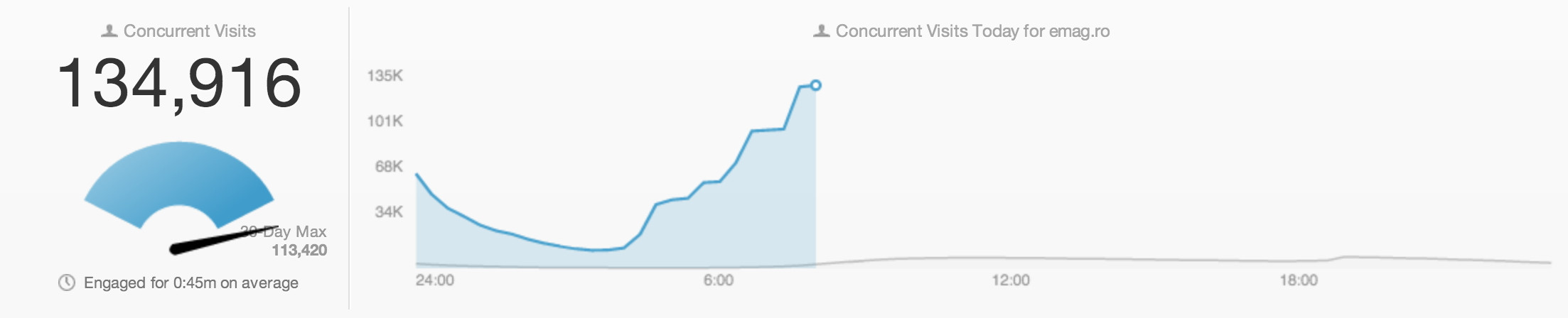 eMAG a anuntat ca numarul vizitatorilor unici este de 709.000 si ca a primit 52.700 de comenzi, epuizandu-se 84% din stocul de televizoare, 83% din laptopuri si 39% din stocul de telefoane, in jurul orei 9.30.