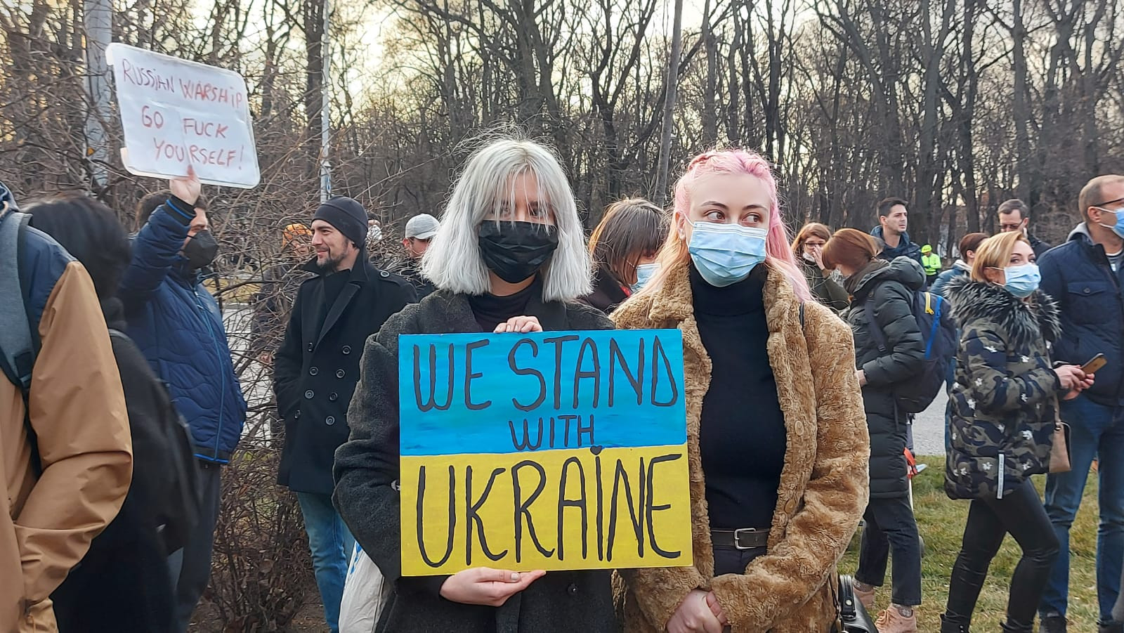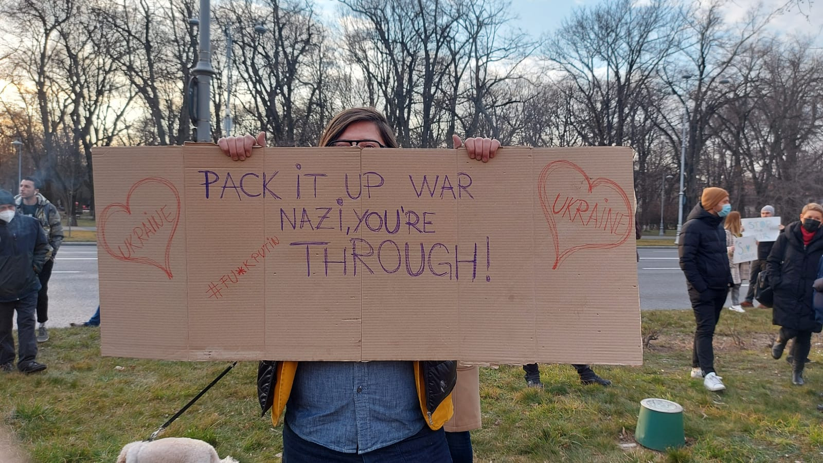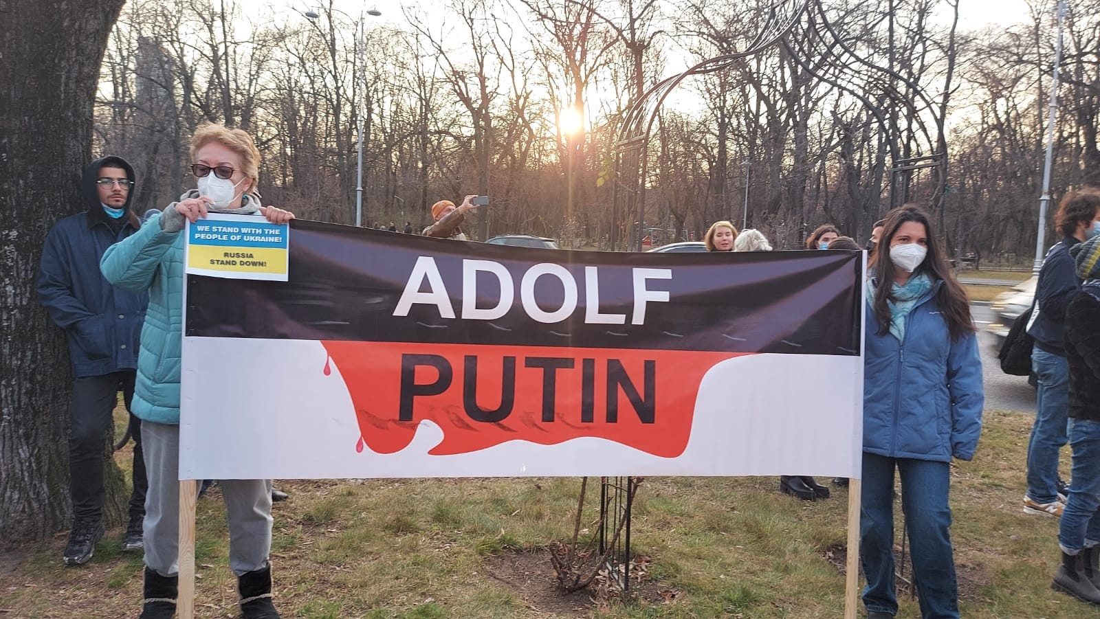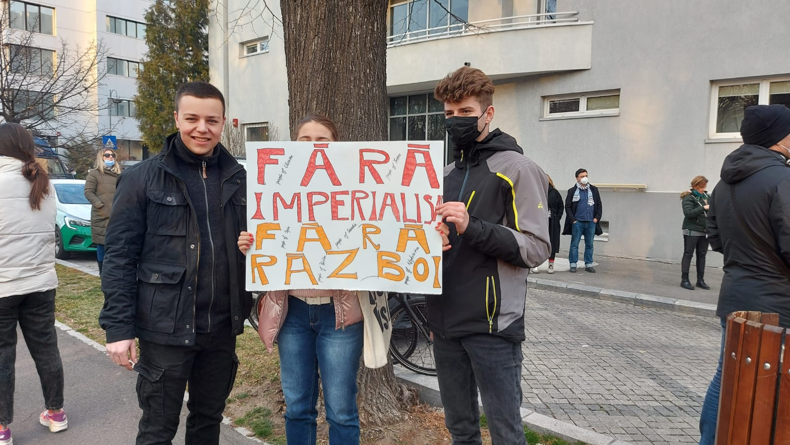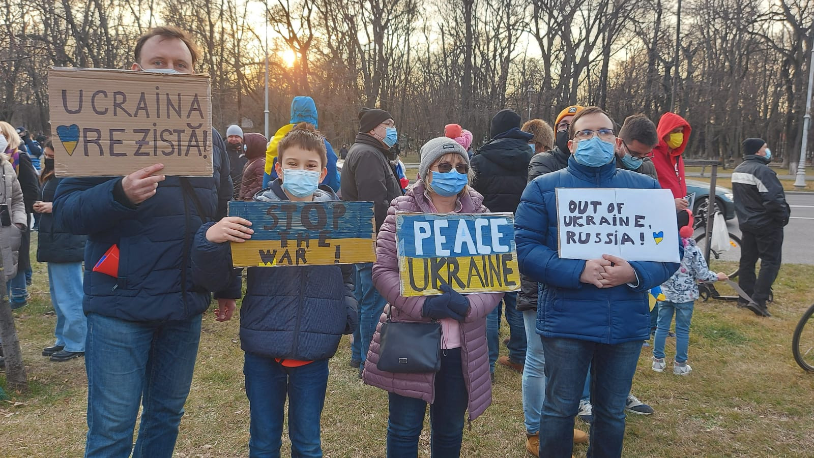 La București, oamenii au pancarte pe care scrie ”Putin, criminal”, ”Ucraina, suntem alături de tine”, ”Adolf Putin”, ”Solidari cu oamenii din Ucraina/ Fără război”.